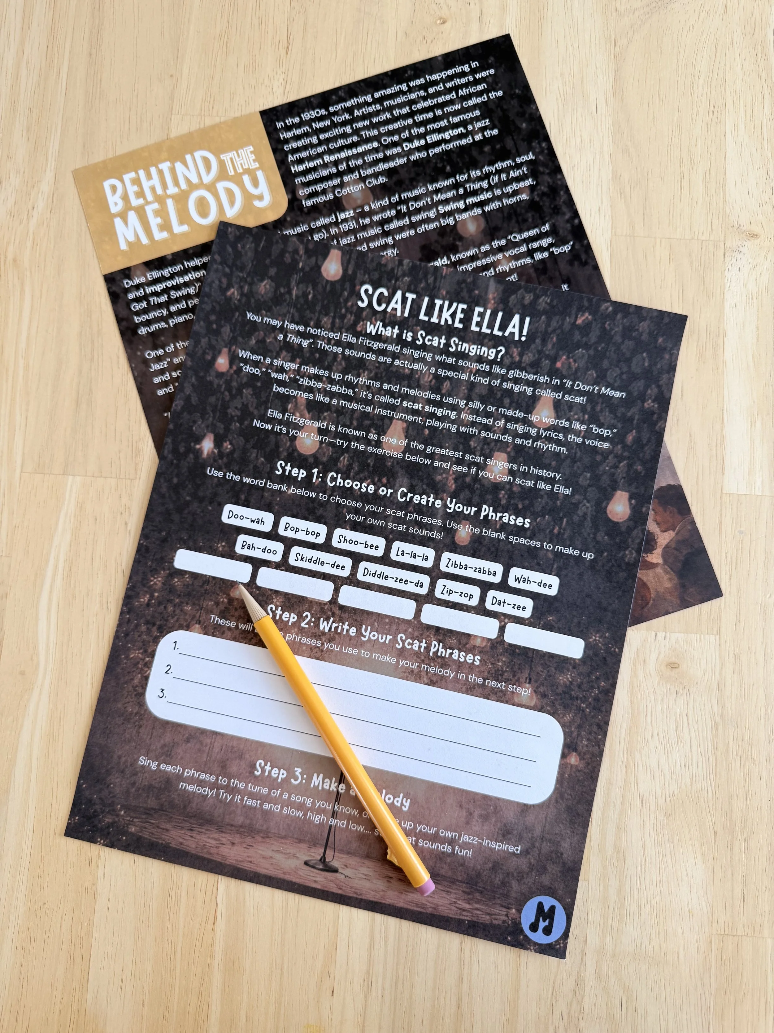 The second page is packed front to back with content designed specifically for that month's song — activities like clapping rhythms, drawing, or writing, alongside deeper dives into the music concepts woven into it. It’s never generic, never repeated, and always custom to the featured song.